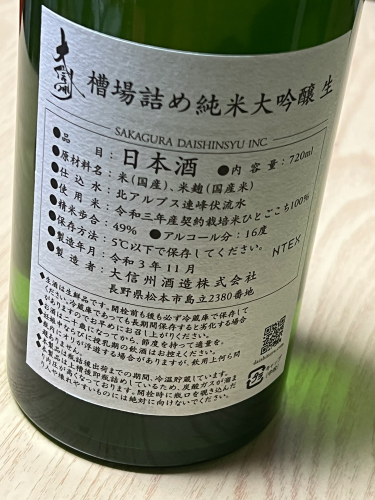 大信州 槽場詰め 純米大吟醸生酒(大信州酒造 / 長野県)