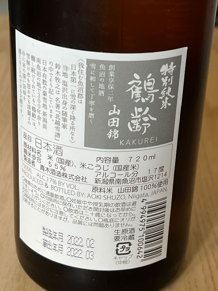 鶴齢 特別純米酒 山田錦55% 無濾過生原酒 令和3BY(青木酒造 / 新潟県)