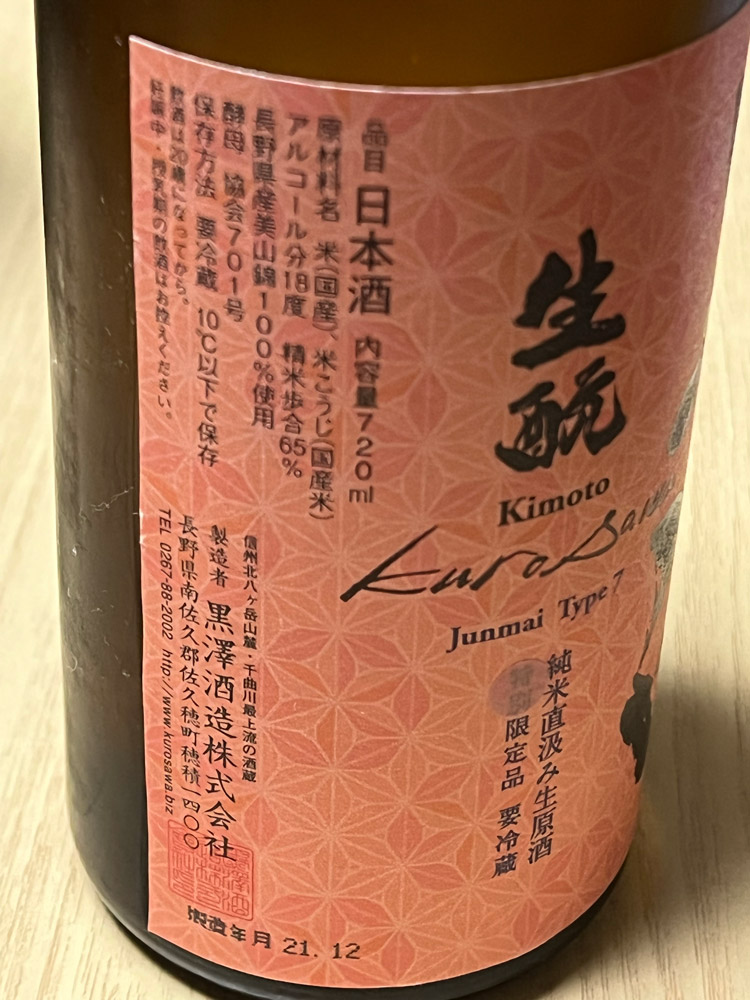 黒澤 type7 生酛純米直汲み生原酒(黒澤酒造 / 長野県)