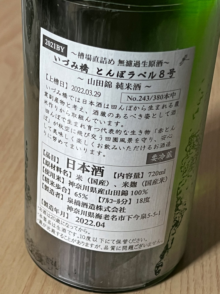 いづみ橋 とんぼラベル8号 純米無濾過生原酒(泉橋酒造 / 神奈川県)