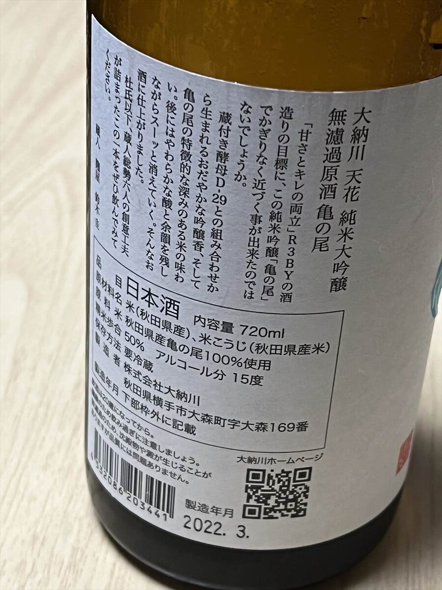 大納川天花 純米大吟醸 無濾過原酒 亀の尾(大納川 / 秋田県)